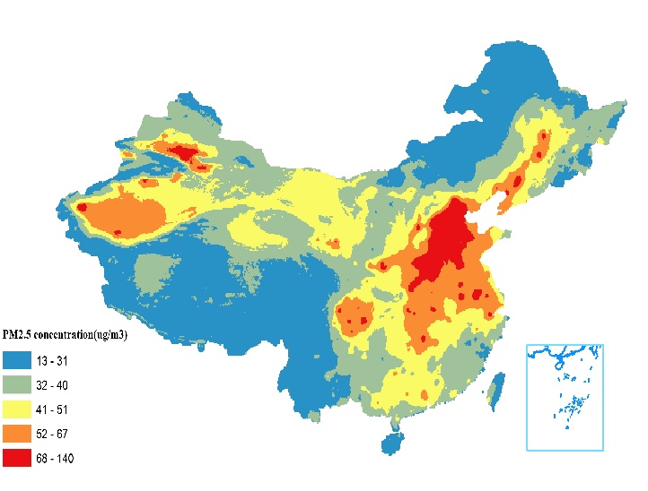 图1. 2007-2010年大气PM2.5的浓度分布情况