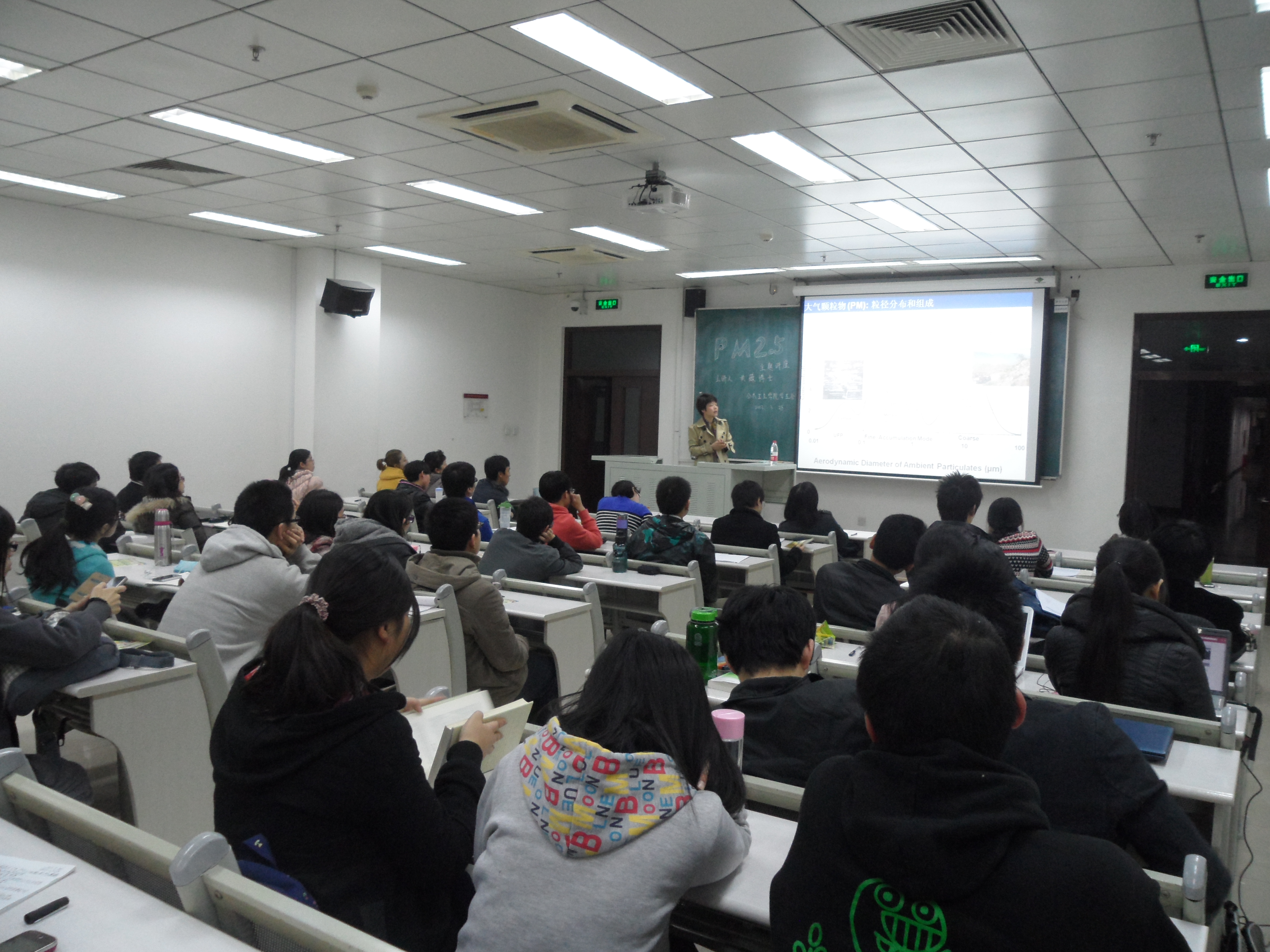 讲座中,黄老师深入浅出地介绍了PM2.5的相关知识,包括PM2.5的定义、来源、成分、监测和危害等。并向我们介绍了国内外大气颗粒物研究的前沿动态,例如美国的“哈佛六城市队列”、“美国癌症学会队列”、“欧洲联合队列”,以及我校在大气颗粒物领域的最新研究成果。通过国内外对比,黄老师指出了我国大气颗粒物研究亟待改进的方面。她在讲解中引入了许多图表及研究数据,向我们展示了PM2.5的具体监测过程、研究手段及危害分析等,表达严谨而又让人易于理解,让同学们学到了不少专业知识和科学研究的方法。