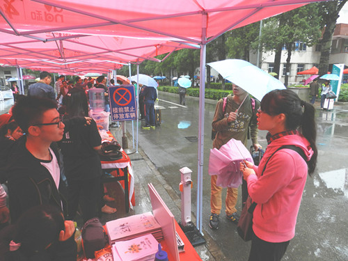 2015年9月5日,必赢中国官方网站学生会在物美超市门前出摊,迎接前来报到的2015级新生。